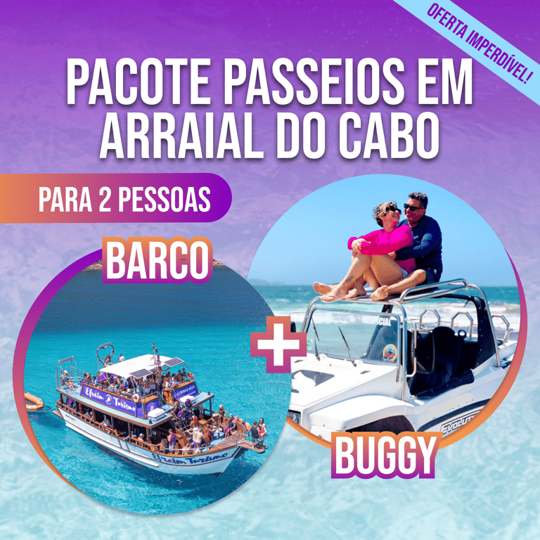 🌊 Pacote Promocional Romântico: Passeio de Barco tradicional + Buggy Arraial do Cabo para duas pessoas - A Experiência Mais Completa do Caribe Brasileiro! 🏖️