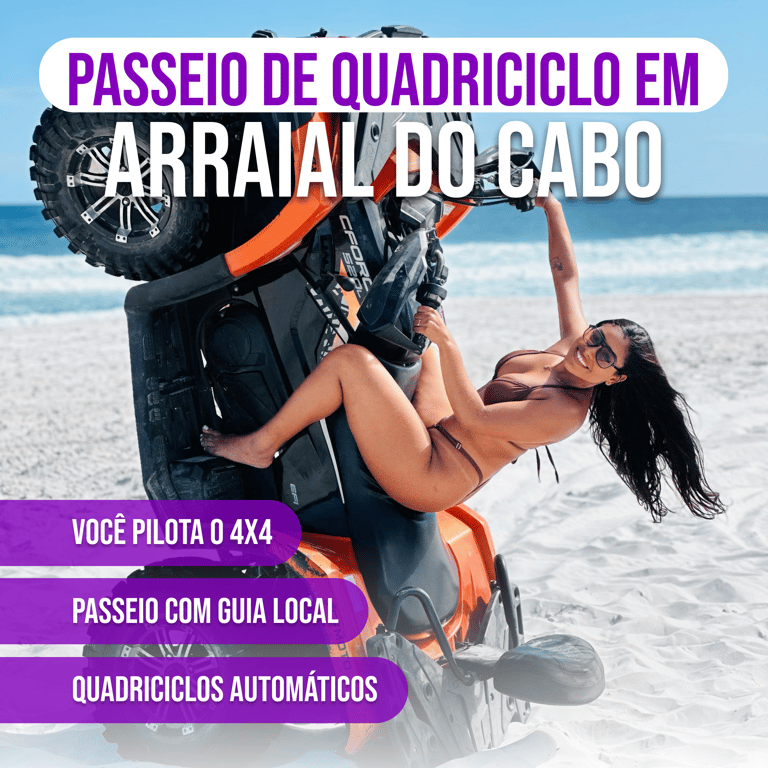 Não perca a chance de viver a aventura de quadriciclo mais emocionante de Arraial do Cabo! Esta experiência única oferece adrenalina pura, paisagens cinematográficas,equipamentos de primeira linha e momentos inesquecíveis no paraíso brasileiro.